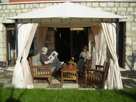 Todo el que quiera puede solicitar el desayuno para salir con fuerzas a hacer turismo y además es un desayuno de los buenos, de los caseros, de los de la abuela: magdalenas, galletas, tostadas con mantequilla y mermelada y un buen zumo natural, que sienta de maravilla por las mañanas. Además, si el tiempo nos acompaña, podemos tomarlo en su jardín, perfectamente cuidado y con un encanto especial. Zonas con sol y otras cubiertas para cobijarnos de él, mesas y sillas, sofás para tener un rato de relax al aire libre… ¡Su decoración nos encanta!